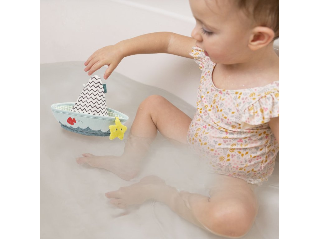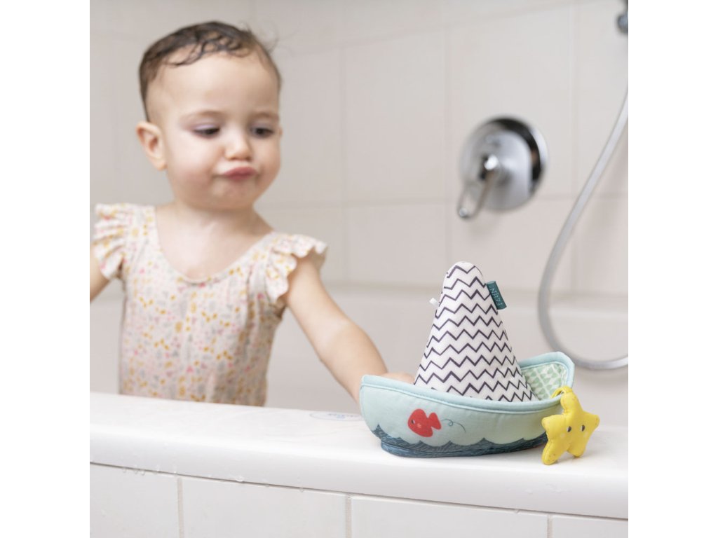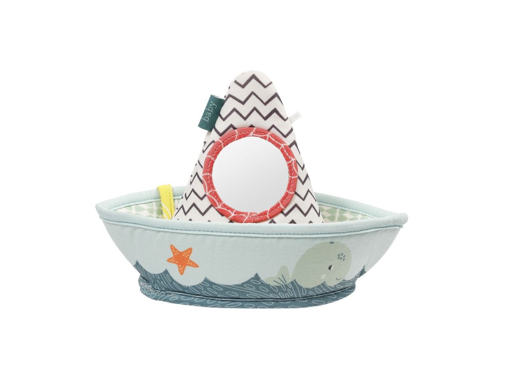 A fürdőhajóval a baba lesz a kapitány. A hajó továbbhajózik víz és nagyszerű fürdőzési élményt nyújt. Rejtett, suhogó papírral együtt a tükör fejleszti a gyerekek képzelőerejét, finommotorikáját, fantáziáját és érzékszerveit. Beleértve van egy cuki krokodil formájú ujjas játék is.