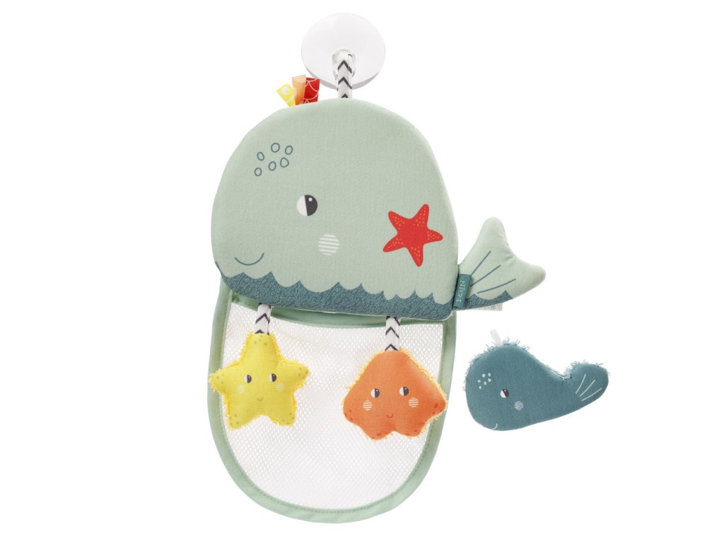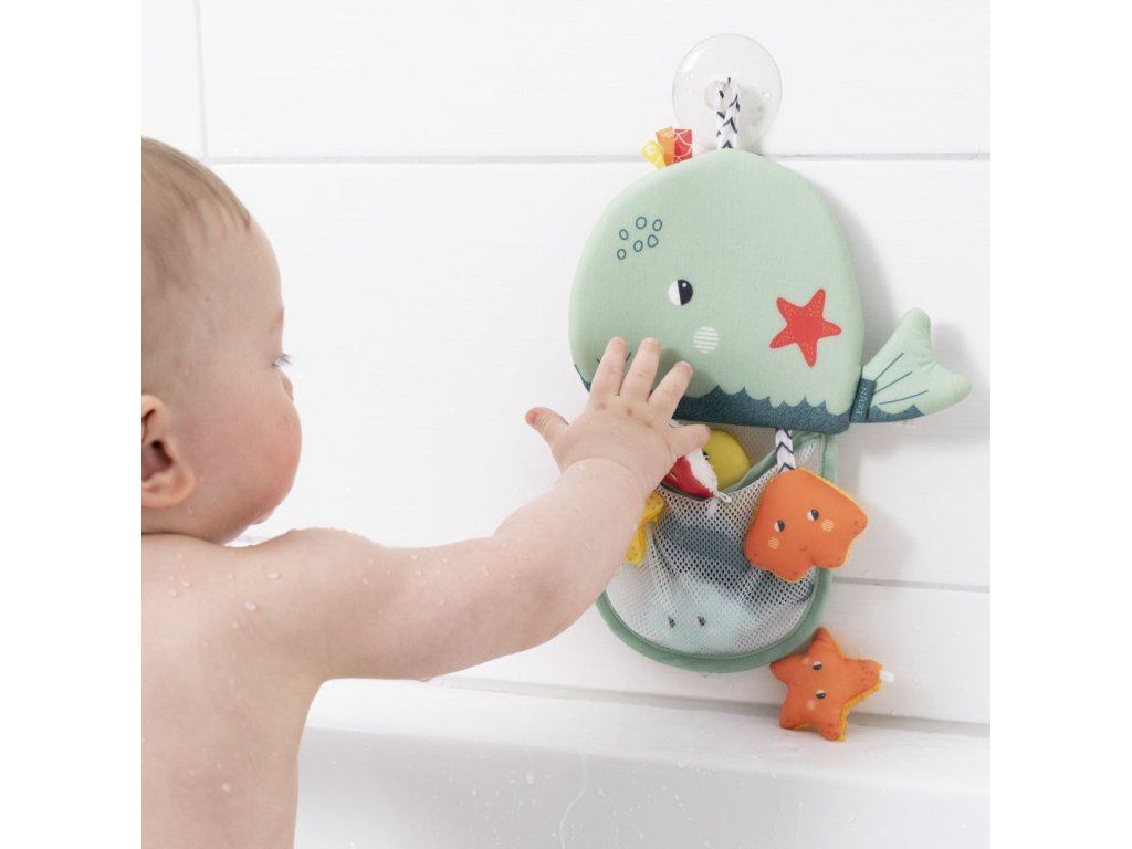 A praktikus, aranyos bálna formájú zsebtáska lehetővé teszi, hogy mindig rendben legyen a fürdőszoba és a fürdőjátékok mindig kéznél legyenek. A tapadókorongnak köszönhetően a bálna a falra rögzíthető, hálójában pedig kisebb játékok is tárolhatók, ahol a légáteresztő képességnek köszönhetően meg is száradnak. A zsebtolvaj susogó papírral és három hurkos plüssjátékkal van felszerelve.