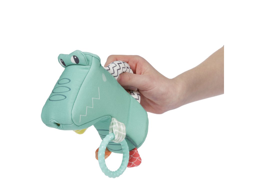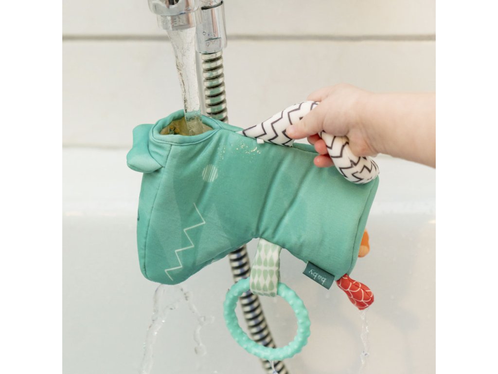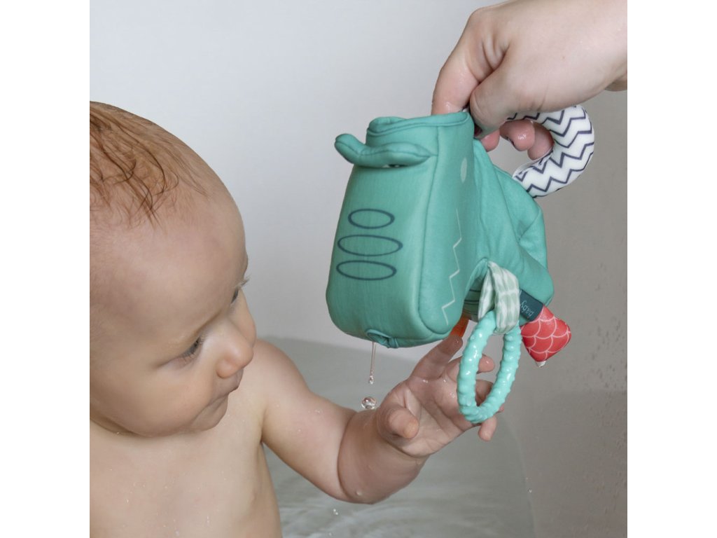 Az aranyos itatókrokodil remek társ a fürdőkádban, a medencénél vagy a tengerparti nyaralásnál. Egy kis szövetből készült öntözőkannát egyszerűen csak rövid időre bemerítjük, vagy megtöltjük folyó vízzel, és kezdődhet az öntözés. A szövet fogantyú ideális a gyerekek kezéhez. A praktikus gyűrűnek köszönhetően a játékot babakocsira vagy autósülésre rögzíthetjük, és magunkkal vihetjük a szabadba.