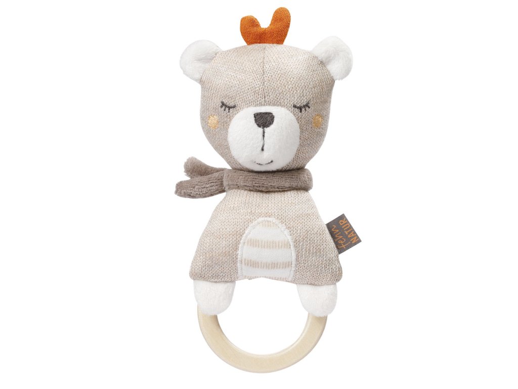A puha mackó organikus pamutból készült, és tökéletes a fogáshoz és az ölelkezéshez. A speciális fa fogantyú lehetővé teszi a puha játék könnyű megfogását, és felébreszti a gyerekekben a felfedezés és a játék vágyát. A csörgő támogatja a gyermek tapintását, hallását és motoros képességeit.