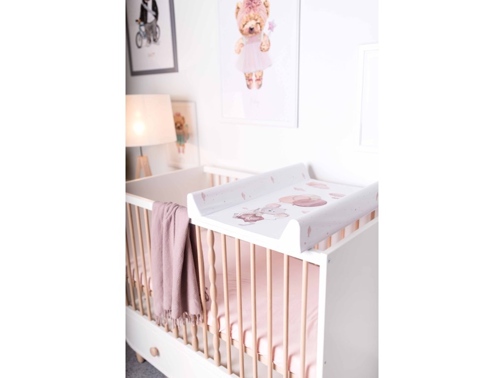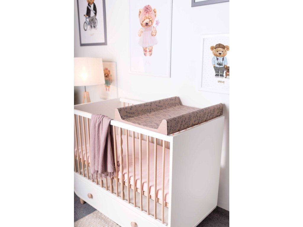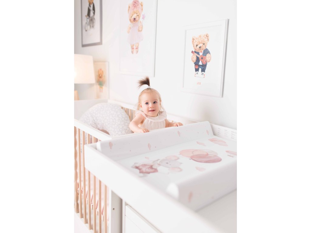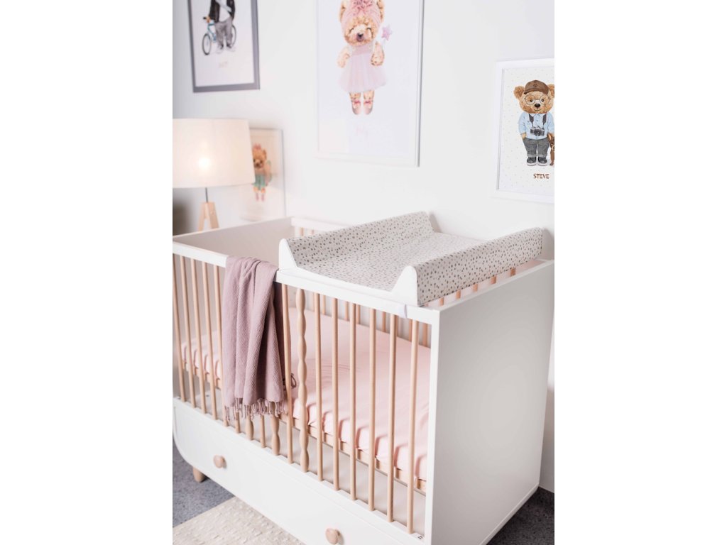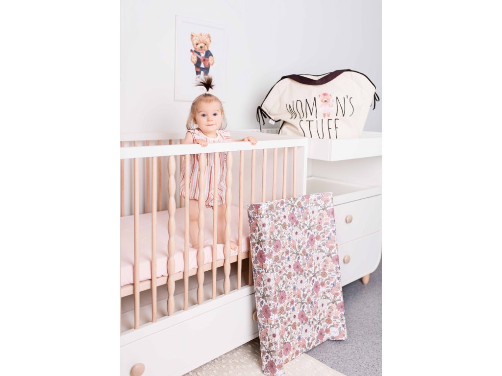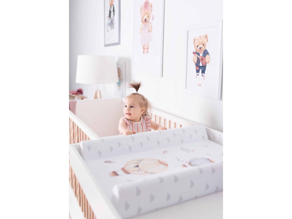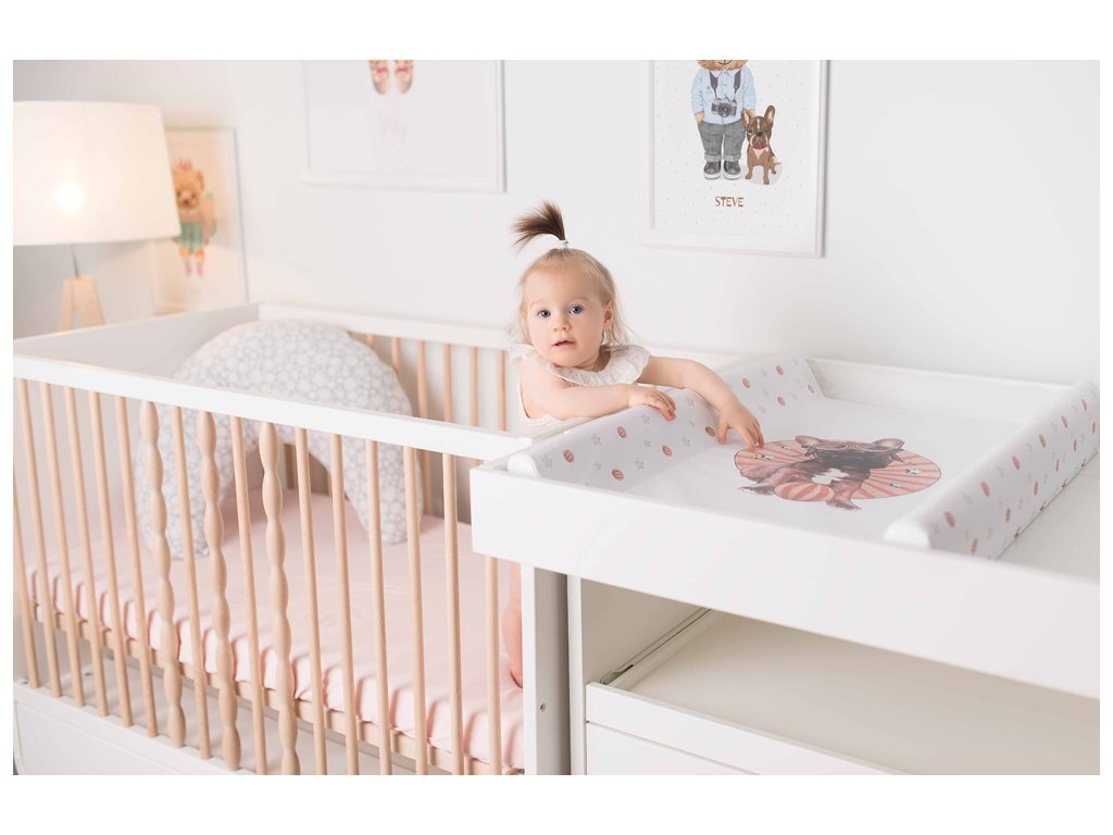 A pelenkázó alátét tépőzáras pántokkal és rögzítőcsapokkal van felszerelve, így könnyedén és stabilan rögzíthető a kiságyhoz, megakadályozva annak elmozdulását. Ez fokozott stabilitást és biztonságot jelent a használat során.