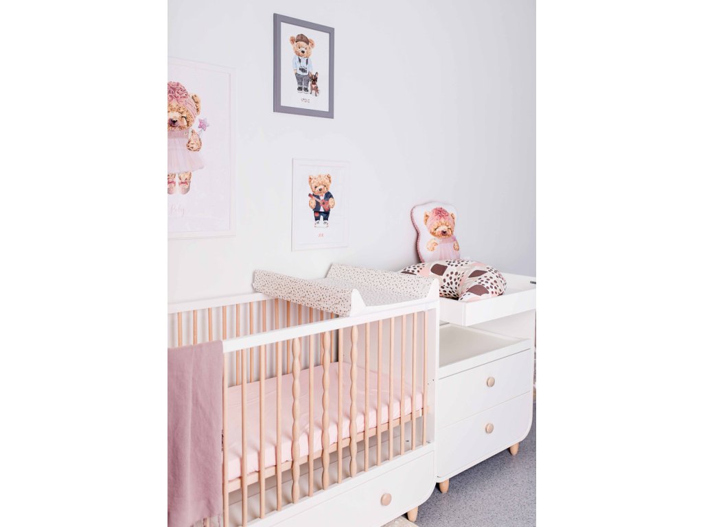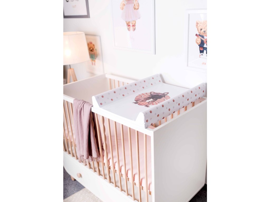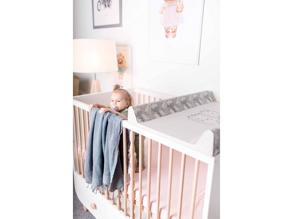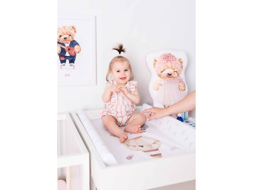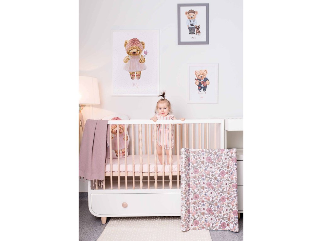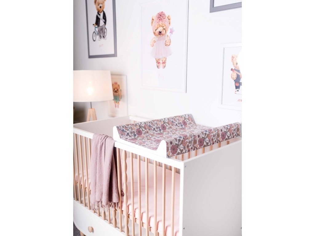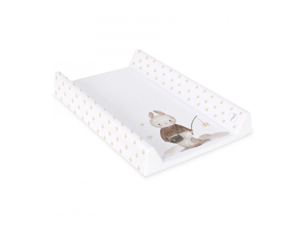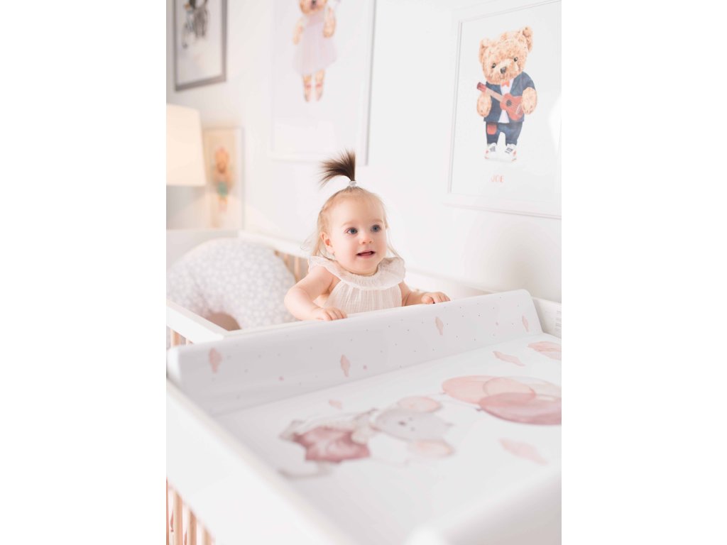 A pelenkázó alátét tépőzáras pántokkal és rögzítőcsapokkal van felszerelve, így könnyedén és stabilan rögzíthető a kiságyhoz, megakadályozva annak elmozdulását. Ez fokozott stabilitást és biztonságot jelent a használat során.