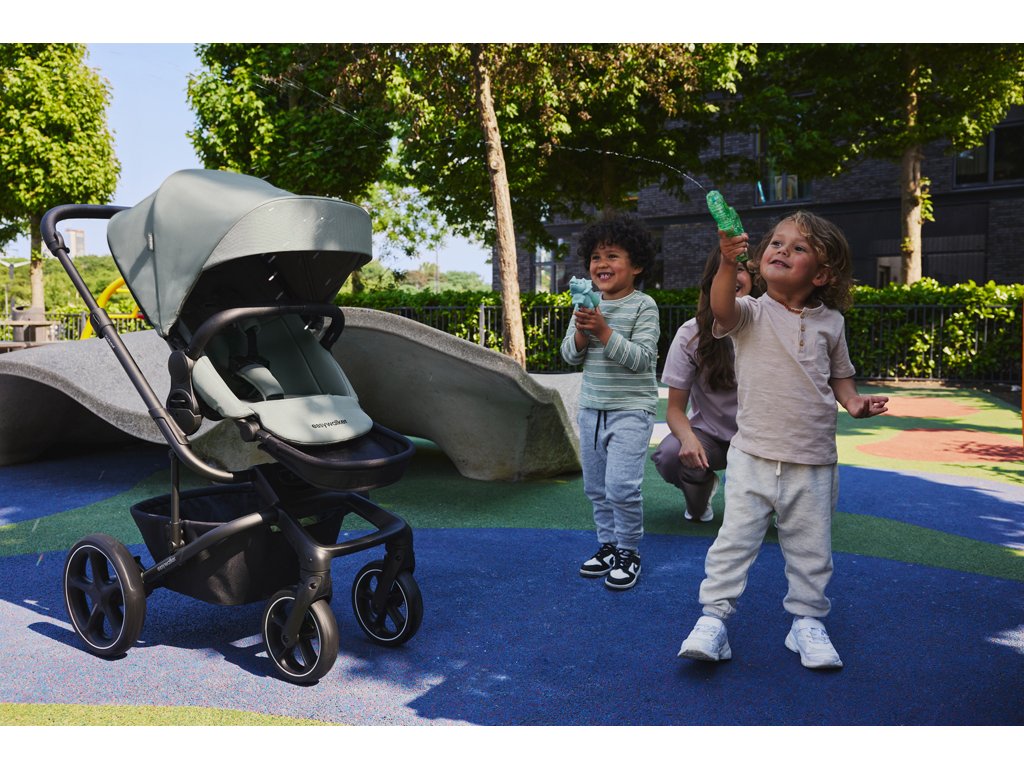 Az extra nagy napellenző UPF 50 védelemmel és vízlepergető bevonattal megóvja a gyermeket a naptól és az esőtől.