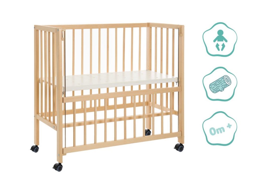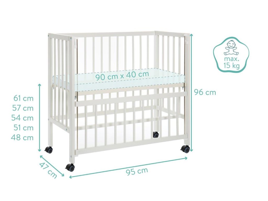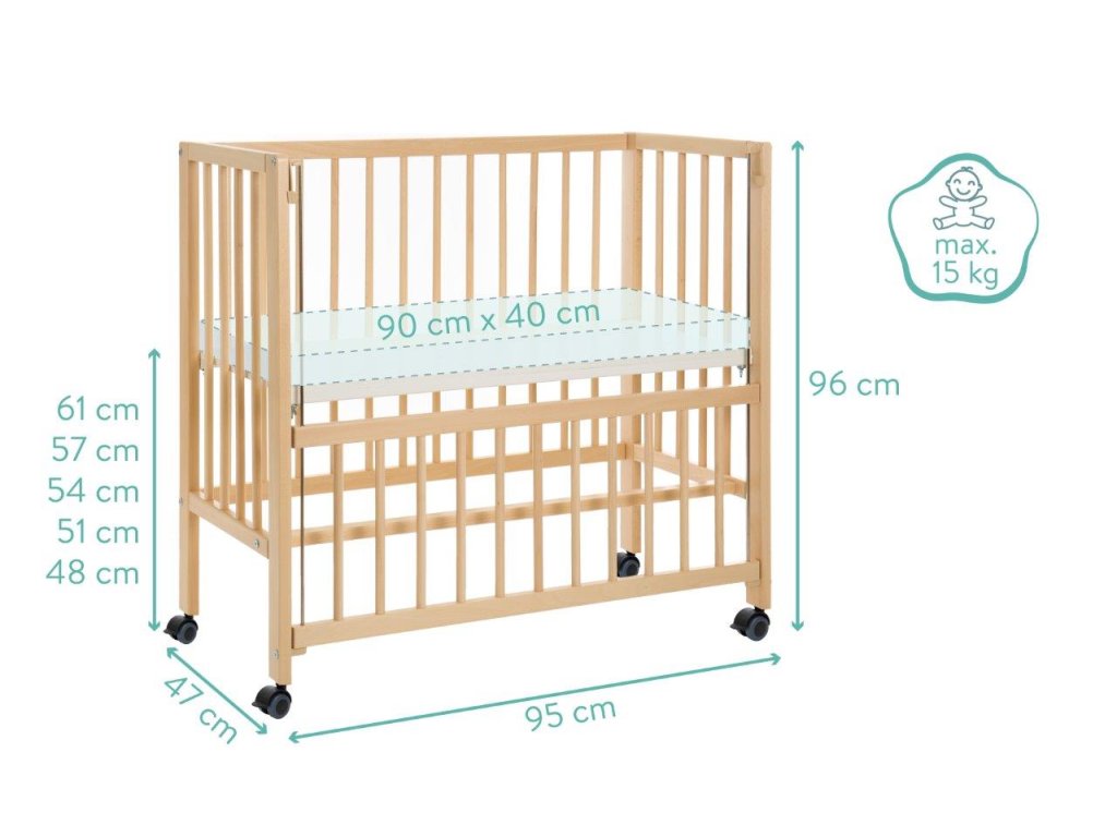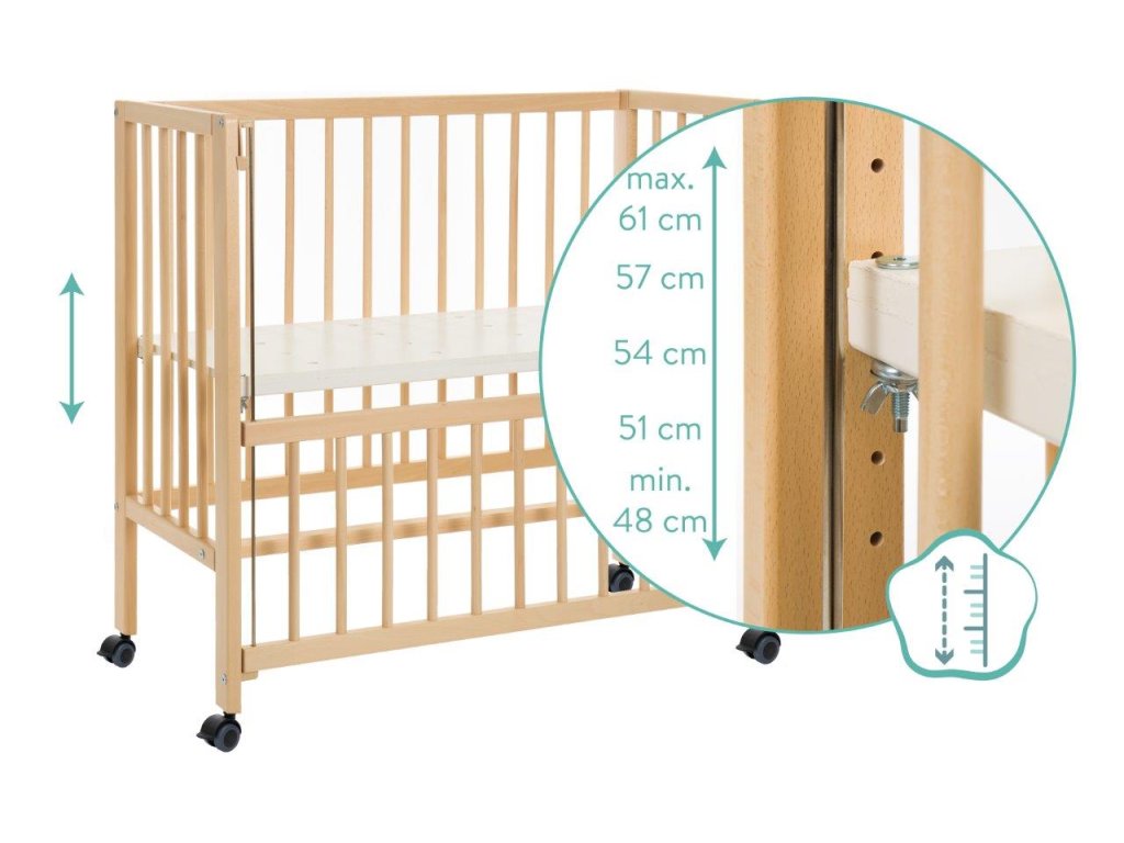 A 90 centiméter hosszú és 40 centi széles kerekeken álló kiságy napközben gyorsan félrecsúszik másnap estig, vagy szociális ágyként szolgál. Kihúzható ágyként a hevederek mindig szorosan rögzítik gyermeke hálóját a nagy szülőágyhoz. Könnyen rögzíthető anélkül, hogy nyomot hagyna. Szinte kevés időbe telik a leválasztás is. A négy simán futó keréknek köszönhetően a kiságy napközben gyorsan eltűnhet egy sarokba, ahol nem lesz útban. De ha a konyhába, a nappaliba vagy a dolgozószobába is szüksége van egy kiságyra, egyszerűen zárja le a nyitott oldalt az integrált tolóoldal segítségével, és így teremtsen biztonságos és mobil nappali helyet a legkisebbek számára. Éjjel-nappal az öt pozícióban állítható magasságú talp biztosítja a mindig szükséges rugalmasságot. A nyitott oldalaknak és a perforált rácsnak köszönhetően babájának mindig elegendő friss levegője van, és nem akadályozza a környező kilátást. A tömör bükkfa biztosítja a szükséges stabilitást és egyben hosszú élettartamot - akár napi mozgás mellett is.
