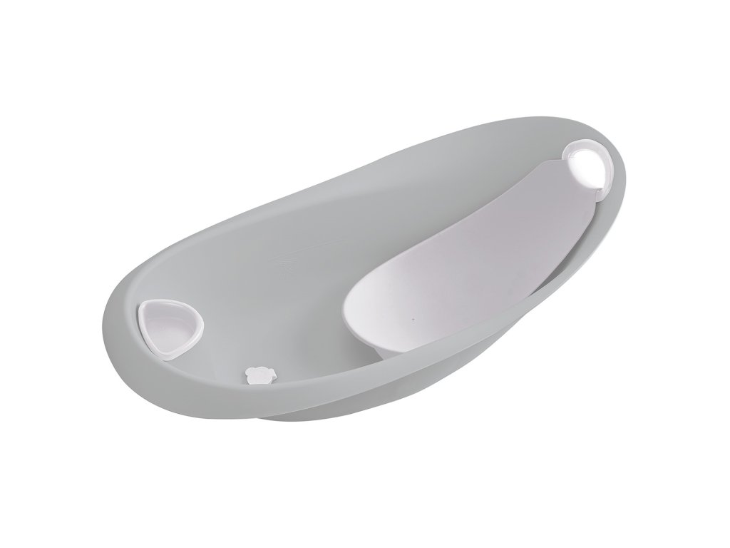 A fürdőkád különféle kütyükkel van felszerelve - puha fogantyúval, vízleeresztő sapkával, összetéveszthetetlen formával és praktikus gyermekágy/üléssel, melyek a kádra rögzíthetők.