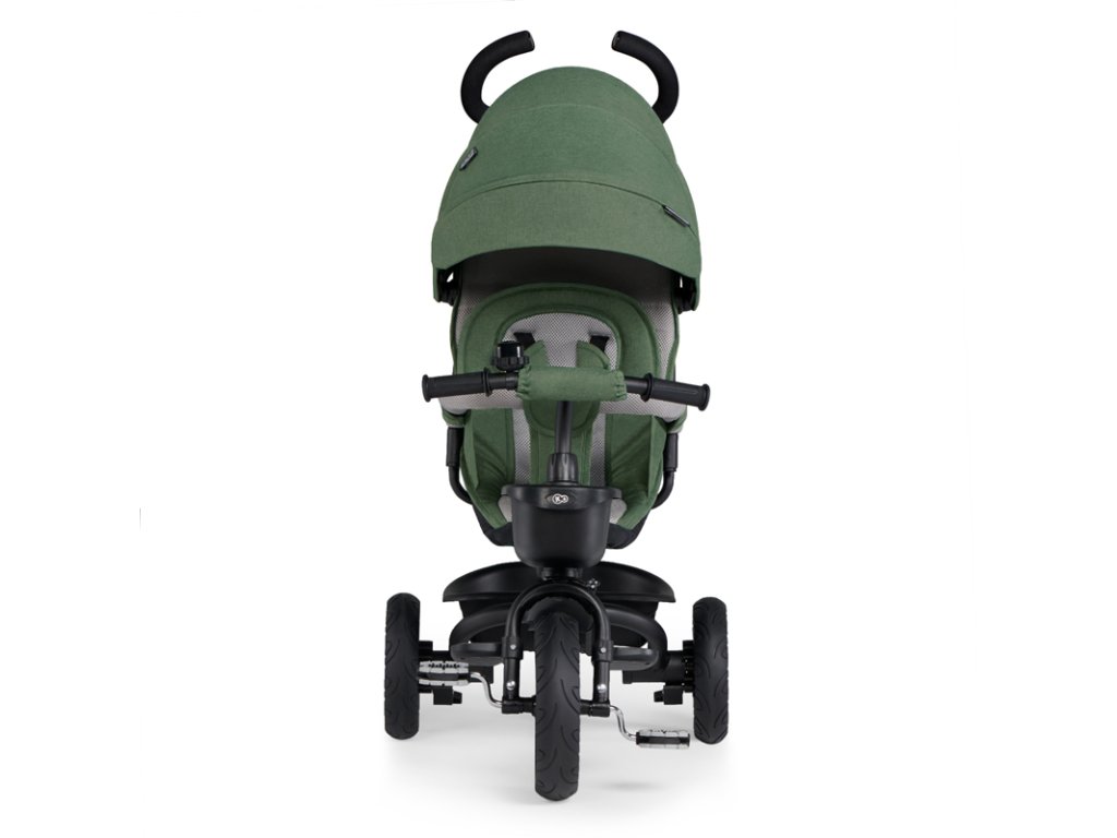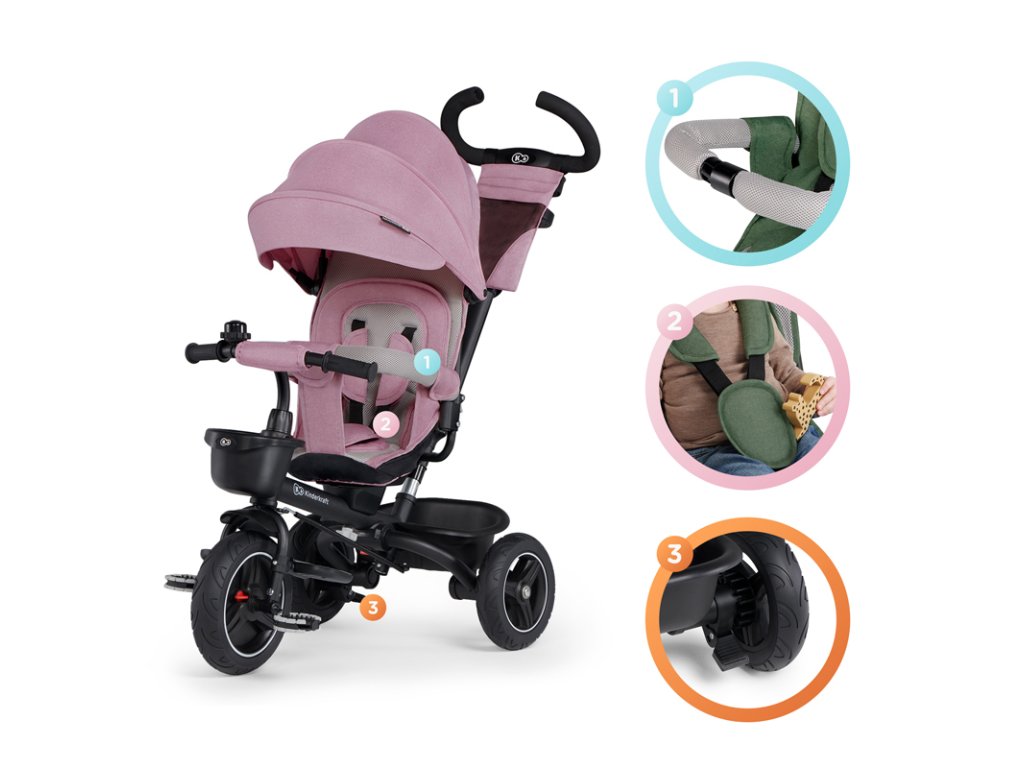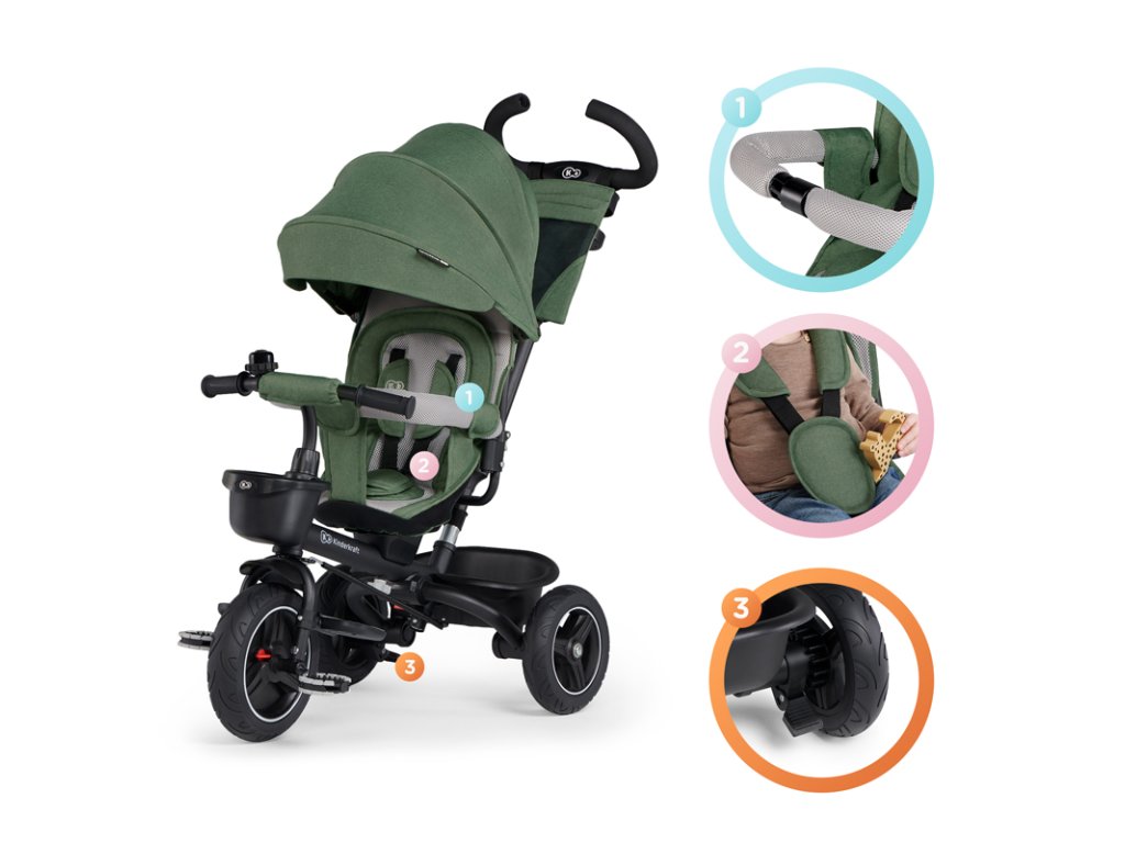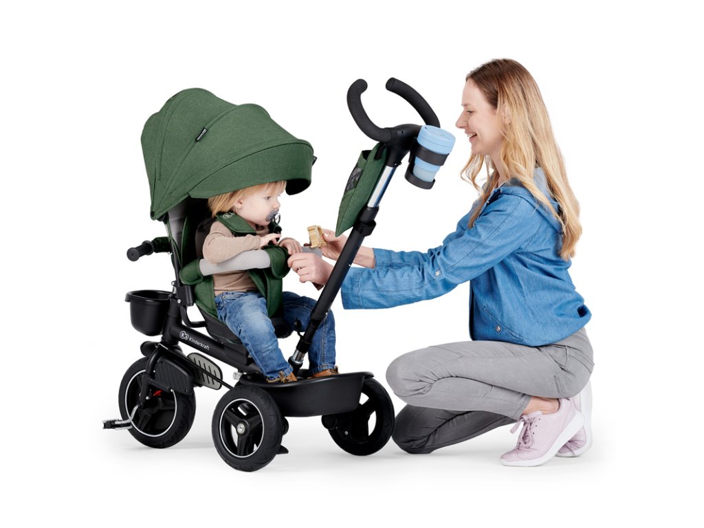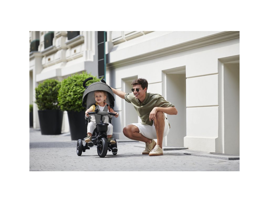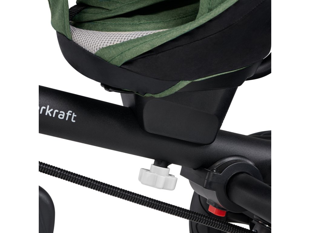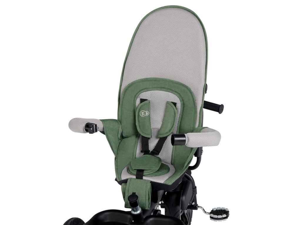 A bicikli 360°-ban elforgatható üléssel rendelkezik, amely a szülővel vagy a menetiránnyal szemben helyezhető el – a gyermek magabiztosabbnak érzi magát, és már az elején szem előtt lesz. Kényelmes, puha huzatú ülés és magas háttámla teszi teljessé a vezetési kényelmet, a gerincnek is megfelelő tartást biztosít a világ meghódítása közben. A kerékpár hárompontos övekkel és kivehető fogantyúval van felszerelve, amely levehető a tricikliről, amikor a gyermek készen áll az önálló utazásra.