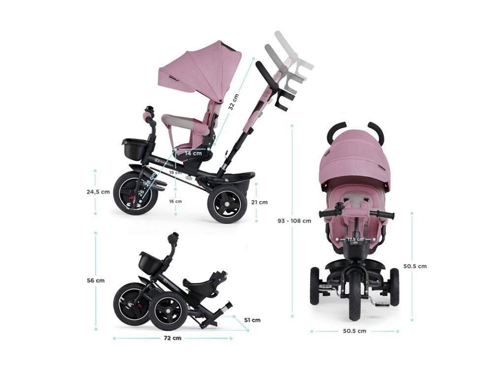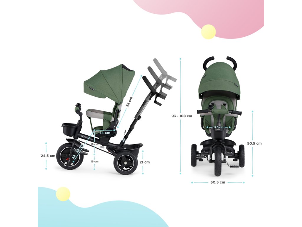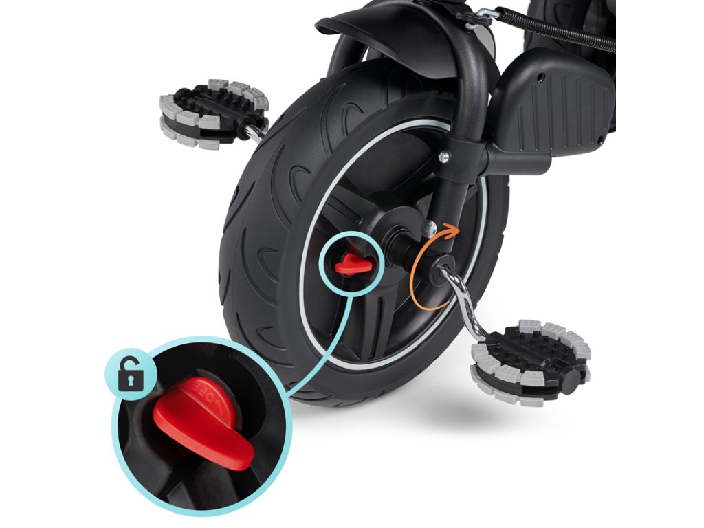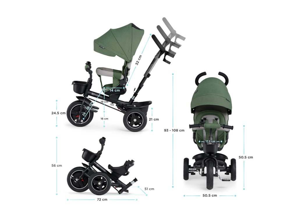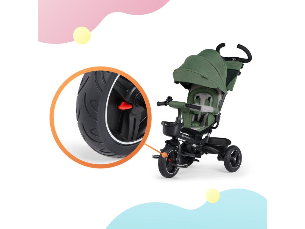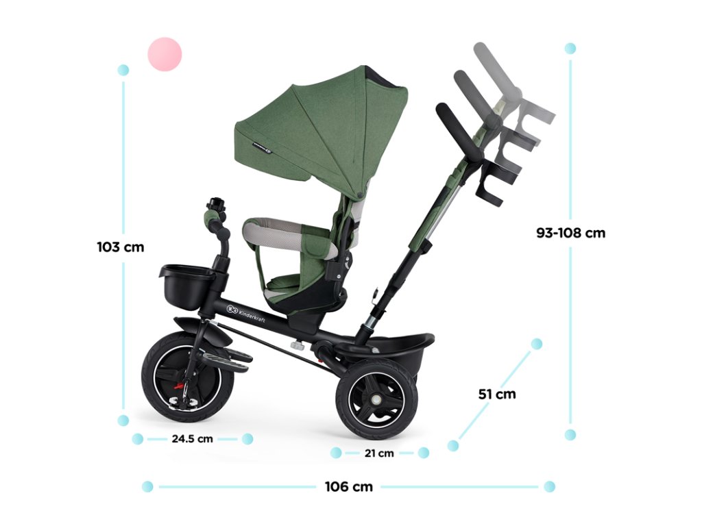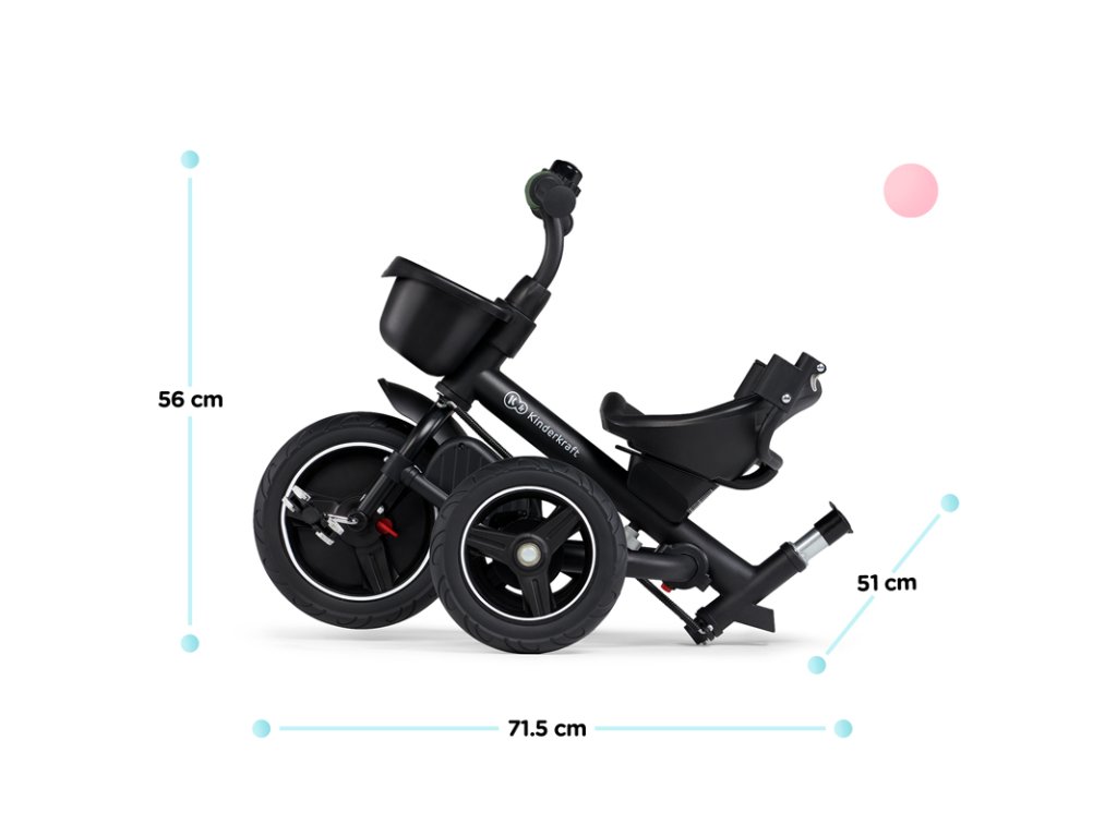 A bicikli 360°-ban elforgatható üléssel rendelkezik, amely a szülővel vagy a menetiránnyal szemben helyezhető el – a gyermek magabiztosabbnak érzi magát, és már az elején szem előtt lesz. Kényelmes, puha huzatú ülés és magas háttámla teszi teljessé a vezetési kényelmet, a gerincnek is megfelelő tartást biztosít a világ meghódítása közben. A kerékpár hárompontos övekkel és kivehető fogantyúval van felszerelve, amely levehető a tricikliről, amikor a gyermek készen áll az önálló utazásra.