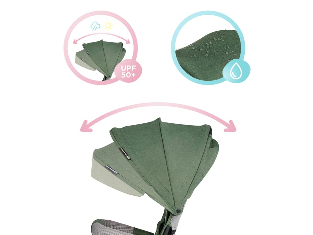– az állítható lombkorona vízálló és UPF50+ szűrővel rendelkezik. Védi a gyermeket a záportól, a széltől és a naptól.