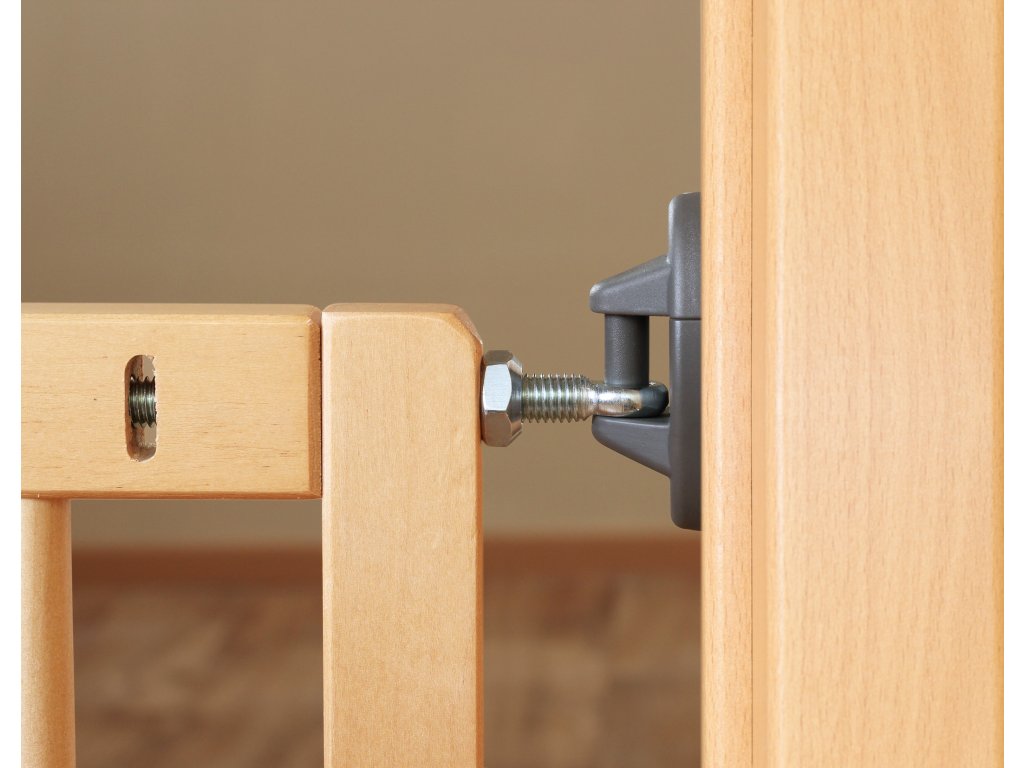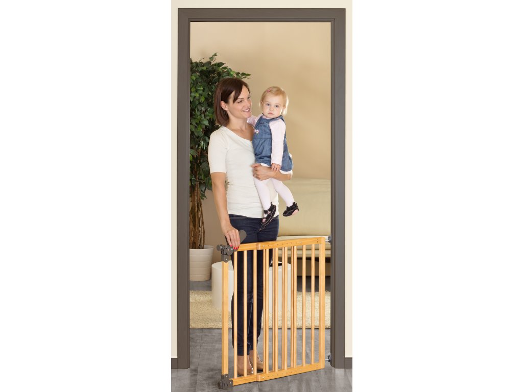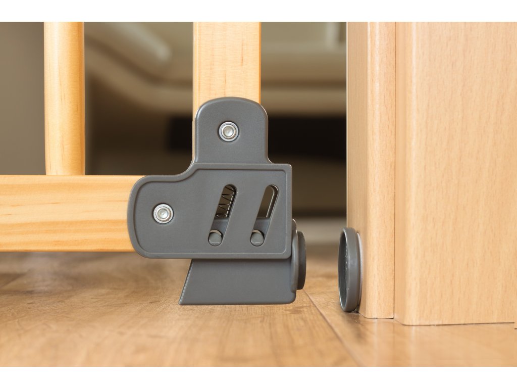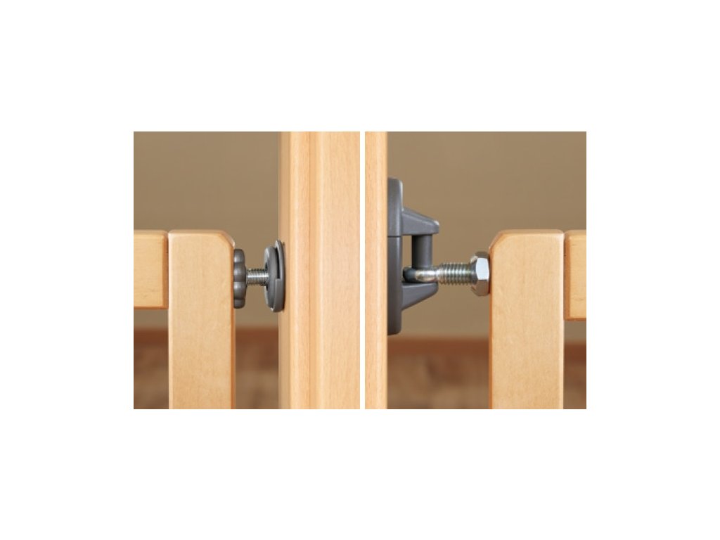 Állítható szélességű biztonsági korlát 75 és 104,5 cm közötti átjárókhoz. 2 módon szerelhető fel: fúrás és csavarozás nélkül, függőleges korlátként vagy a falhoz rögzítve. A fúrás nélküli változat használatakor a korlát nem nyitható, hanem teljes egészében eltávolítható. A korlát alkalmas a lépcső tetejére. Az állítható 4 pontos rögzítés egyéni szélességbeállítást biztosít a felső és alsó rögzítési pontokon, így a korlát falakon vagy lépcsőkorlátokon is használható.