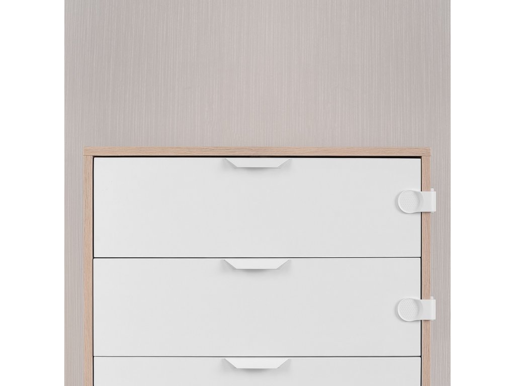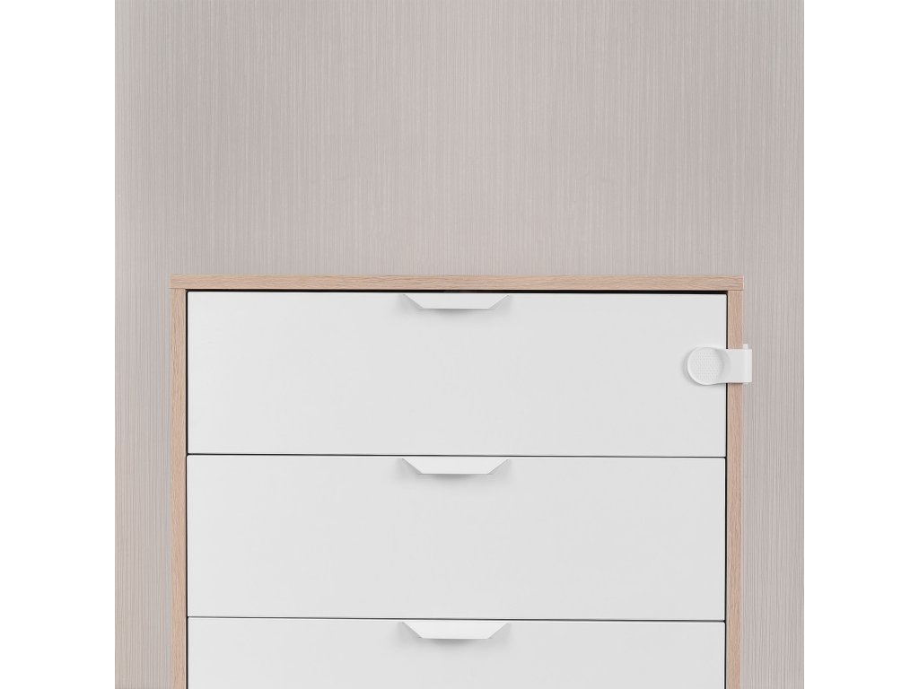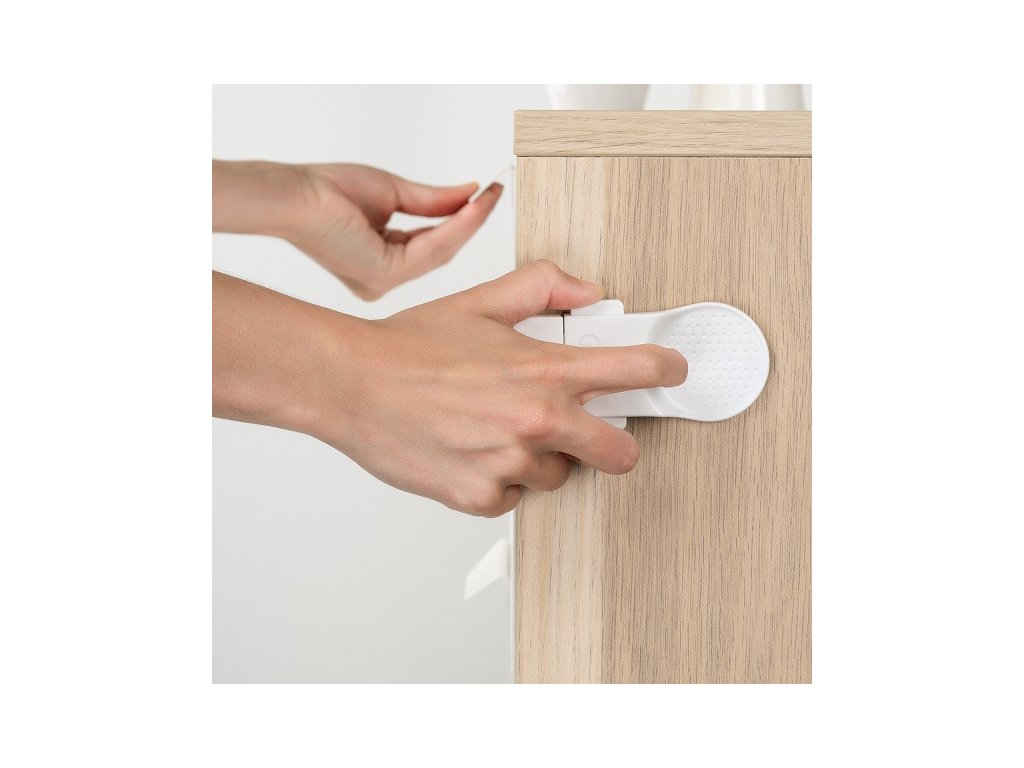 Két biztonsági elem szilárdan kapcsolódik a szekrényhez, és automatikusan visszahúzódik, amint a fiók becsukódik. A fiók automatikusan záródik, amikor becsukja. Ezzel elkerülheti, hogy elfelejtse újra bezárni a zárat, és gyermeke ne férhessen hozzá a szekrény tartalmához.