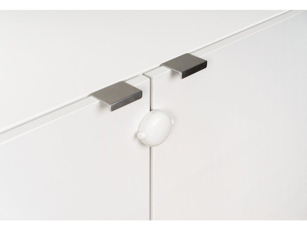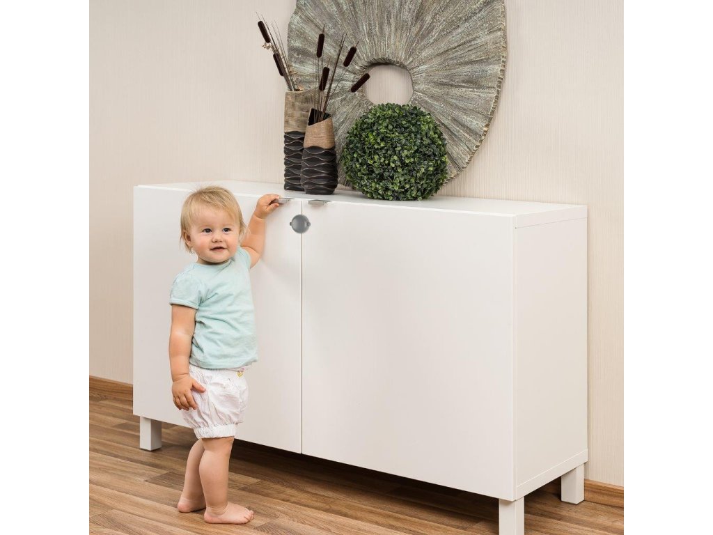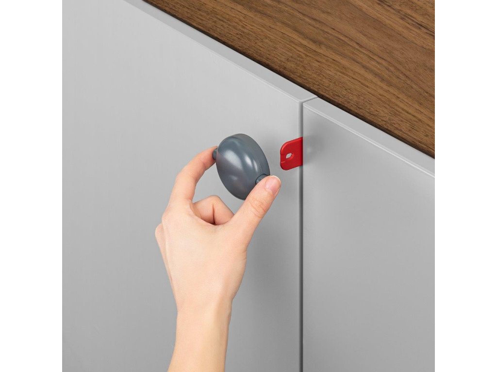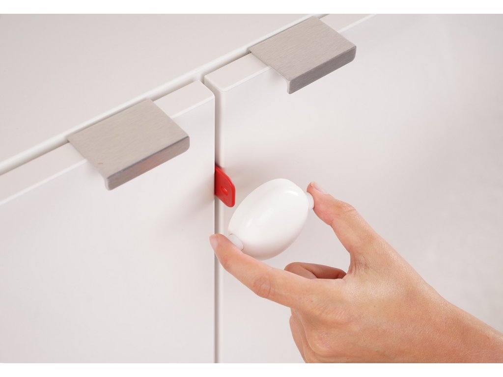 A szekrények és tartalmuk biztonságosan el vannak zárva a kis felfedezők elől. A szekrényt a felnőttek számára is könnyű kinyitni egy kézzel. A csomagban található egy praktikus mágneses fali tartó a zár biztonságos tárolására. A piros jelzés emlékezteti Önt, hogy a zárat újra aktiválja, ha gyermekek vannak jelen.