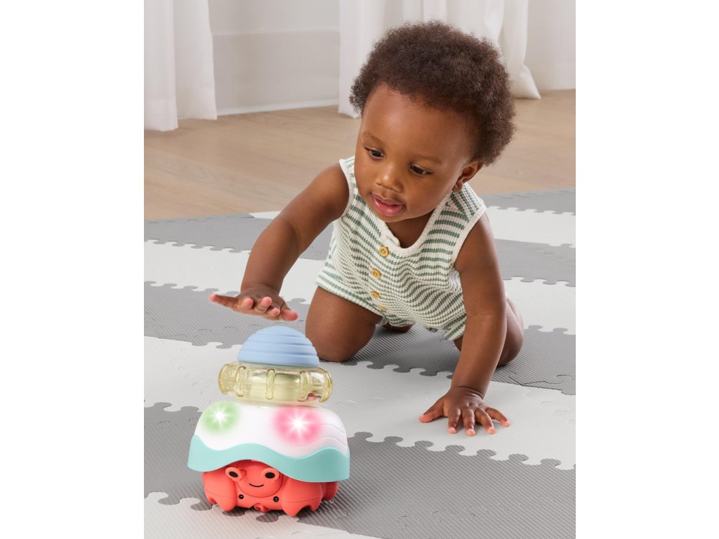 Játék közben hangokkal és fényekkel jutalmazza a babát, így fejleszti az érzékszerveket és a mozgáskoordinációt