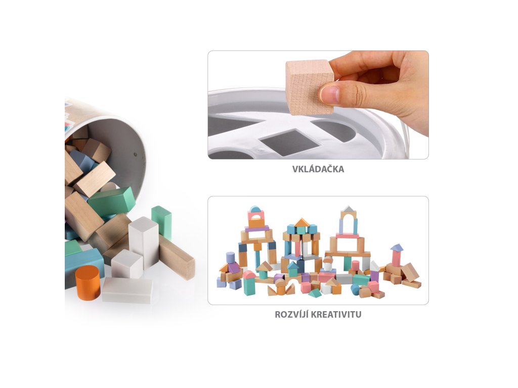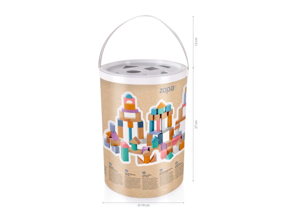 A kockák kiváló minőségű fából készültek, és praktikus vödörrel rendelkeznek a könnyű tárolás és hordozhatóság érdekében. A vödör fedelét úgy alakították ki, hogy a gyerekek gyakorolhassák a formák felismerését, miközben szórakoztatják a kockák takarítását. A praktikus pánt a könnyű hordozhatóságot biztosítja, hogy a gyerekek bárhová magukkal vihetik a kockákat, így otthon, látogatáskor vagy kint egy takarón játszhatnak.