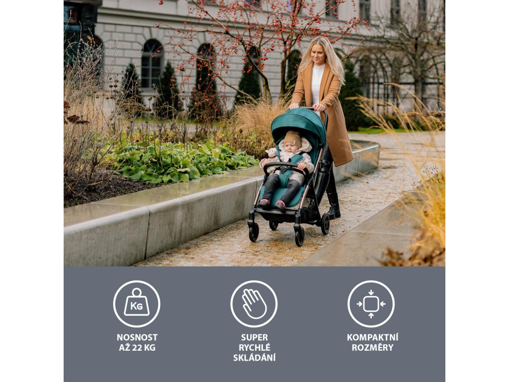 Könnyű, ugyanakkor erős alváz, kis méretek és olyan egyszerű az összeszerelés, hogy egy kézzel is kezelhető. A Quiq 2 babakocsit minden szülő szeretni fogja, aki szeretne utazni, és minden utazást még élvezetesebbé szeretne tenni. A gumirugós kerekek jól bírják a macskaköveket a városban és az egyenetlen terepet a természetben való séták során. Kompakt méreteinek köszönhetően minimális helyet foglal el, és összecsukva is megállja a helyét. A szellőzőablakokkal ellátott meghosszabbított tető megbízható védelmet nyújt a napsugárzás ellen és a szellőzést. A rudak varrtak, ami kiemeli a babakocsi egyszerű kialakítását. A Quiq 2 22 kg-ig szállítja kis utazóját.