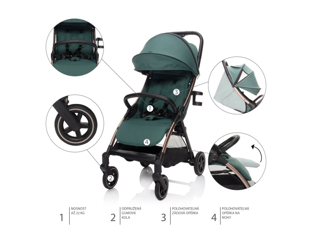 A puha sportülés 5 pontos biztonsági övvel van felszerelve, mágnescsattal. A babakocsi steppelt rúdja lehajtható a gyermek könnyebb ültetése érdekében. A szellőzőablakkal ellátott, kihúzható lombkorona védi a gyermeket a naptól és a széltől. Tartalmaz egy kosarat, amibe akár 3 kg holmi is belefér, amit utazás közben jó kéznél tartani.