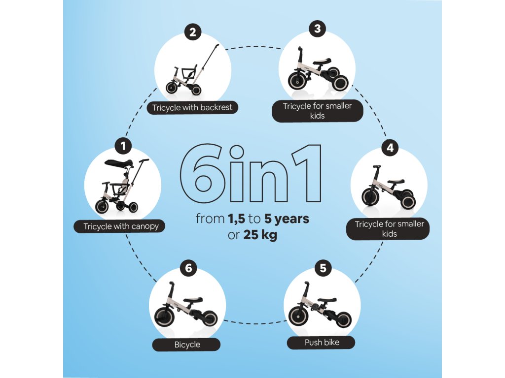 Az intelligens kialakításnak köszönhetően az egyes elemek szerszám nélkül is gyorsan levehetők vagy átalakíthatók. A tricikliről futóbiciklire vagy kerékpárra való átállás mindössze néhány percet vesz igénybe. Kompakt méreteinek köszönhetően autó csomagtartójában is könnyedén elfér – ideális utazáshoz is.