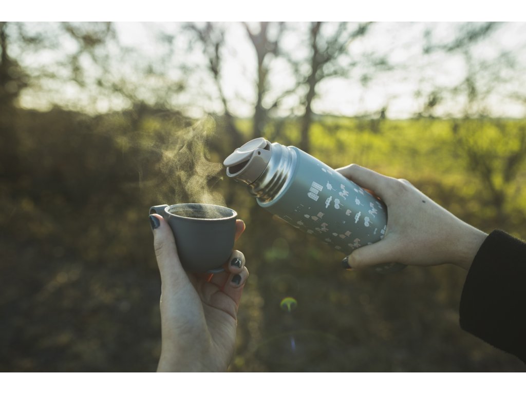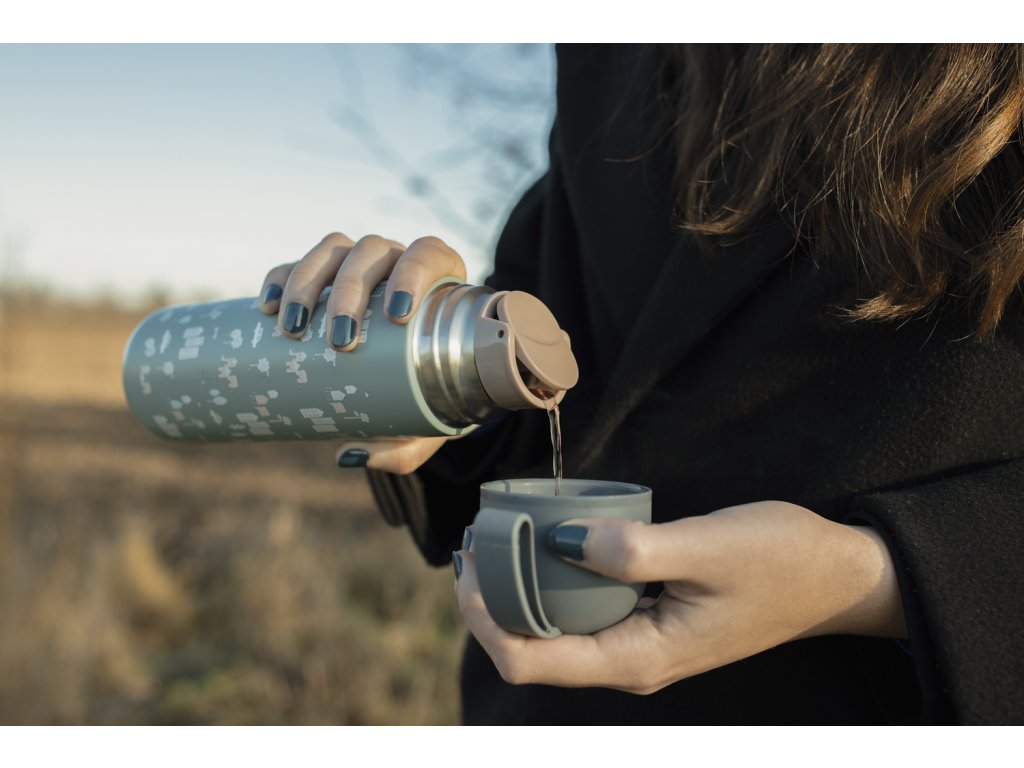 A vákuumszigetelésnek köszönhetően a termosz kívülről nem melegszik fel forró folyadékkal megtöltve. A kényelmes fogás érdekében a termosz szilikon italtartóval van felszerelve.