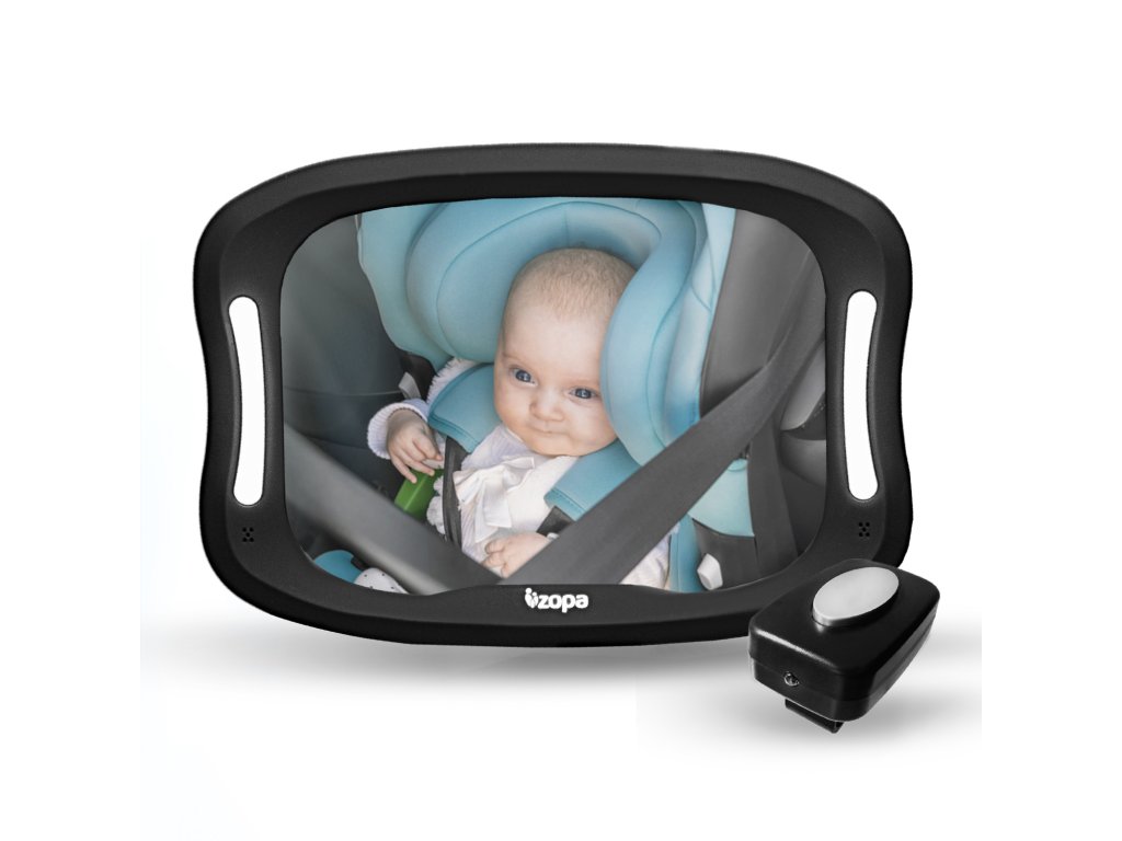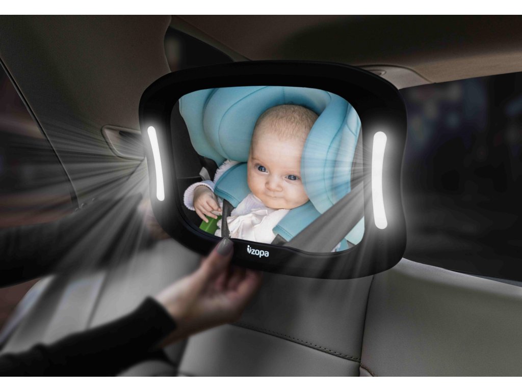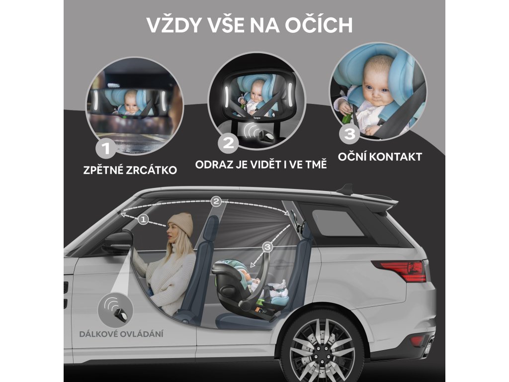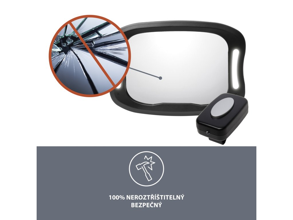 Tartsa szemmel gyermekét vezetés közben, még sötétben is. A praktikus LED-es világítású tükör lehetővé teszi, hogy gyenge fényviszonyok mellett is lássa gyermekét. A tükör törésálló és könnyen felszerelhető az ülés fejtámláira. Az elem élettartama hosszú, távirányítóval vezérelhető (tükör 3× AA, távirányító - 2× AAA. Az elemek nem részei a csomagnak.