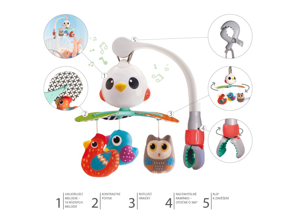A forgó játék nem csak vizuális stimulációt kínál, hanem külön forgó játékként is használható. Az autósüléshez, kiságyhoz vagy babakocsihoz való három rögzítési módnak köszönhetően gyermekét mindig szórakozás veszi körül.